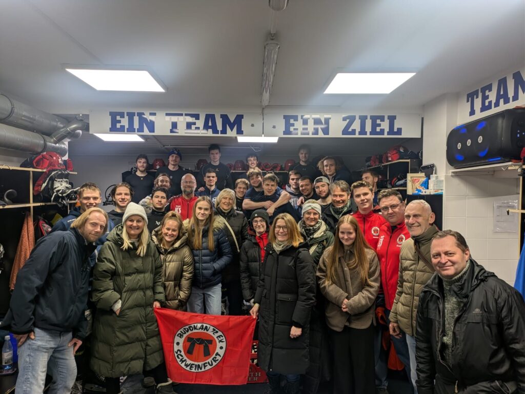 „Ein Team – Ein Ziel“ prangt in großen Lettern über der Kabine der Mighty Dogs – ein Motto, das in seinem Geist auch die Budokan-Familie vereint. Sowohl der ERV Schweinfurt (die Heimat der Mighty Dogs) als auch der Budokan Schweinfurt sind traditionsreiche Schweinfurter Vereine, die nicht nur für erfolgreichen Sport, sondern auch für Gemeinschaft und Zusammenhalt stehen.
